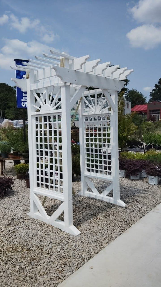 Create a stunning focal point for your ceremony with our handcrafted wedding arbors. Built with timeless design and lasting materials, these arbors add elegance to your special day and become a permanent feature in your garden for years to come. Featuring signature details like Greco-Roman rafter ends and classic sunburst accents, each piece is custom-made with care and built to endure—just like the vows made beneath them.