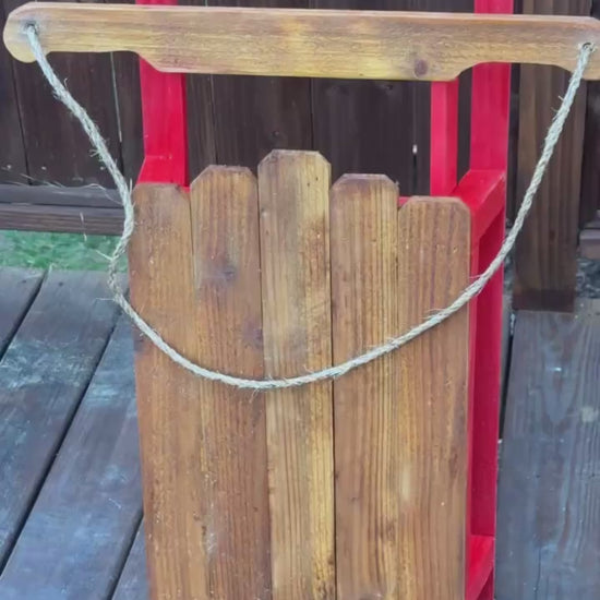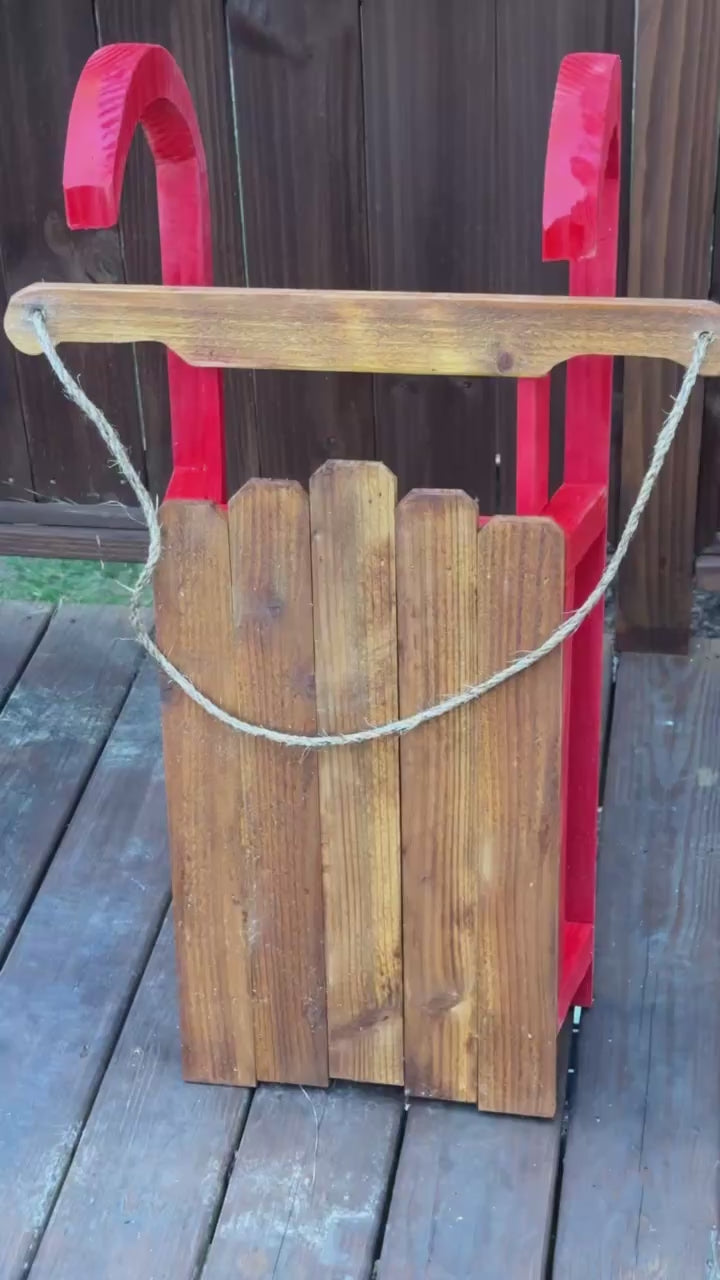 Add timeless holiday charm to your home with this handcrafted decorative wooden sled, beautifully made from pine and cedar. Featuring a richly stained wood body, bold red runner blades, and a classic pull rope, this piece blends festive spirit with vintage farmhouse style.