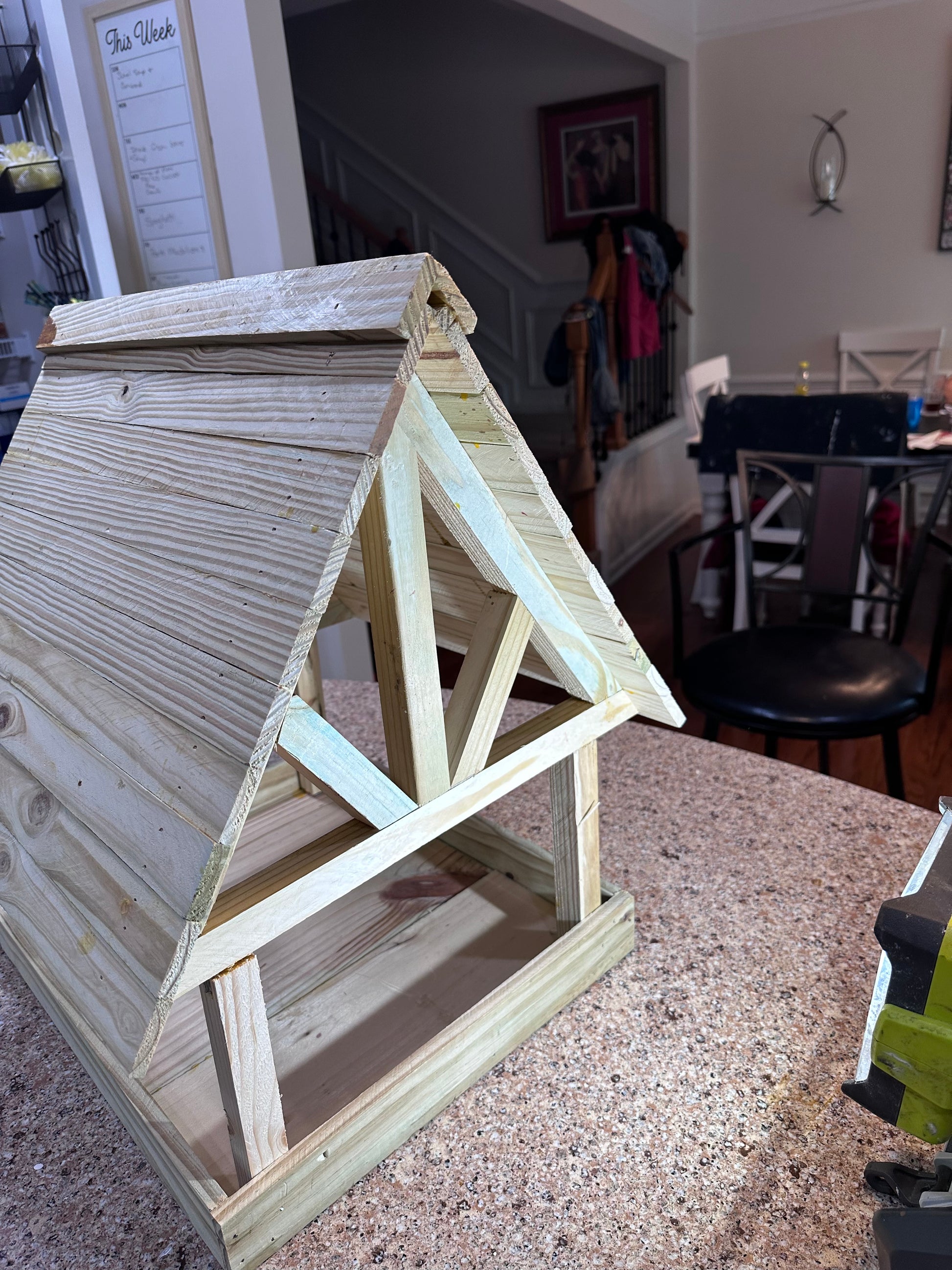 Dress up your yard with this stylish, classic, thoughtfully-designed bird feeder. Featuring timber framing, classic yoke bracing and a cedar shake style roof, the eaves extend an inch and a half past the outside edge of the feeder tray, helping to deflect rainwater. This feeder has a lower opening: there is approximately eight inches between the top of the feeder tray and the roof, all to to help deter predator birds and protect smaller birds. Each piece is hand-milled. The roof is protected with two coats of honey-teak Australian timber oil stain and two coats premium white semigloss paint adorn the sturdy 1"x1" columns and timber framing. This custom-designed bird feeder is definitely "Beautifully Built" and "Durably Designed" - a Pilkington Woodworks Signature piece!